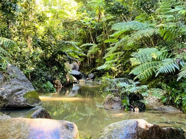 A lush green forest scene with a small stream surrounded by ferns and rocks.