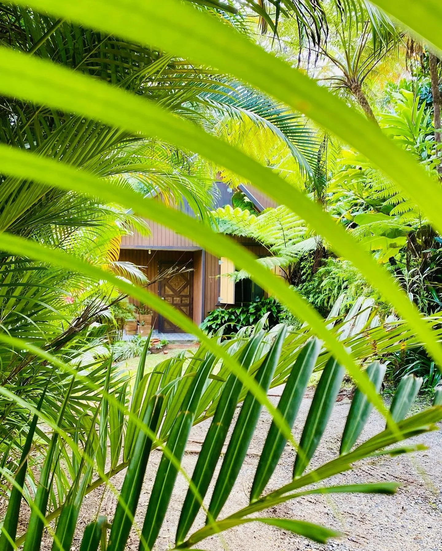 A small wooden house surrounded by lush green tropical plants and palm leaves, with a gravel pathway leading to the entrance.